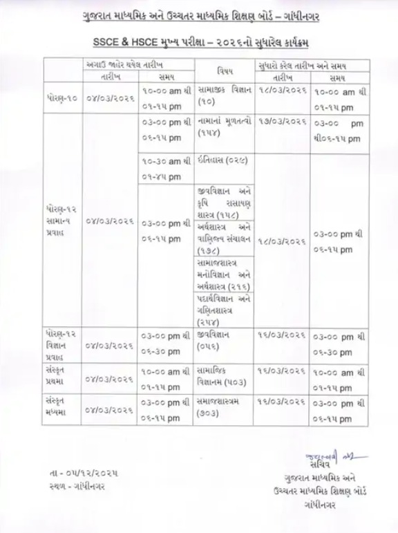 ગુજરાત બોર્ડ દ્વારા જુની તારીખમાં ફેરફાર કરી નવી તારીખોની જાહેરાત કરવામાં આવી છે.