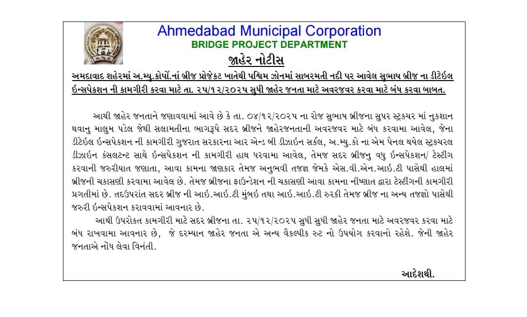 અમદાવાદના મુખ્ય સુભાષ બ્રિજમાં સુપર સ્ટ્રક્ચરને નુકસાનની શંકા સામે આવતાં તેને તાત્કાલિક જાહેર જનતા માટે બંધ કરી દેવામાં આવ્યો છે. આ બ્રિજ 25 ડિસેમ્બર, 2025 સુધી બંધ રહેશે, જે દરમિયાન નાગરિકોને વૈકલ્પિક રૂટનો ઉપયોગ કરવાની સલાહ આપવામાં આવી છે. આ નિર્ણય બ્રિજની સુરક્ષા અને વધુ તપાસને ધ્યાનમાં રાખીને લેવામાં આવ્યો છે.